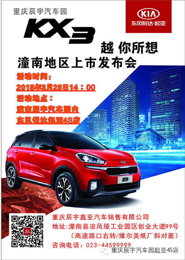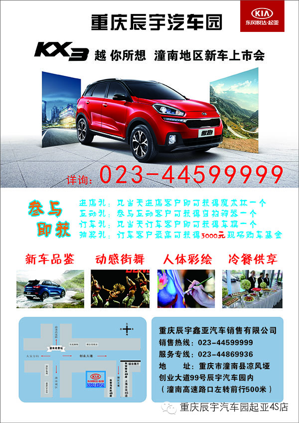3月28日14:00-17:00,潼南辰宇汽车园东风悦达起亚4S店KX3新车上市会,香车美女惊艳全场!现场人体彩绘,歌舞表演,冷餐供享,红包放发,我约你{:soso_e184:}还等什么,不见不散!!!{:soso_e106:}{:soso_e106:}{:soso_e106:}
